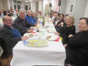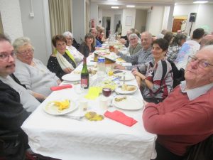 Record battu cette année. Ce sont en effet 63 convives qui ont participé à notre couscous suivi de sa soirée dansante. Dès 19 heures, les premiers verres d’apéritif étaient servis au moment où Pascal Hanne, notre musicien, égrainait ses premières notes d’accueil. Les convives arrivaient en rangs serrés, se retrouvaient avec plaisir pour échanger, verre à la main, les dernières nouvelles de la famille ou du village. On s’écartait pour laisser passer notre traiteur de Senonches qui apportait le couscous, aussitôt suivi du pâtissier du Mesnil et ses gâteaux. Puis chacun prenait place à table pour profiter à plein de toutes ces gourmandises, couscous, salade, fromage, dessert, Clairette de Die, café ; toutes ces « étapes » séparées, bien sûr, d’un intermède musical et dansant. Puis, on poussait quelques tables pour faire de la place et les danses se succédaient jusque tard dans la soirée.